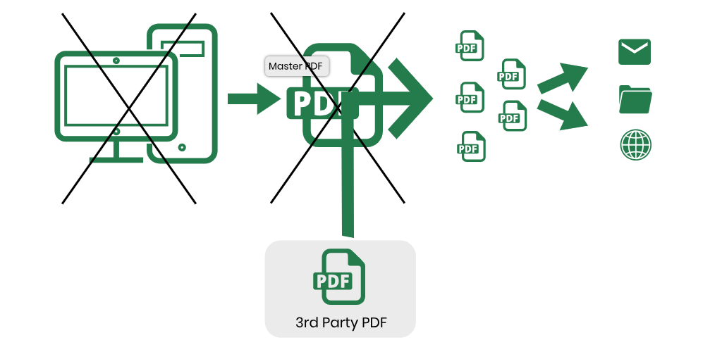 PDF-eMONITOR eliminates the need for phase 1 (creation of Master PDF) to be run by PDF-eXPLODE. PDF-eMONITOR will accept a PDF with the invisible tags ‘built-in’ and created with ANY PDF writer available. By using your preferred third party PDF engine, you can potentially eliminate the 3500 page PDF processing limitation that PDF-eXPLODE PDF engine has. Furthermore, you can also optimize the time taken to produce the master PDF by using faster PDF writer software. This externally produced master PDF must be saved into a PDF-eMONITOR configured ‘INBOX’ folder.